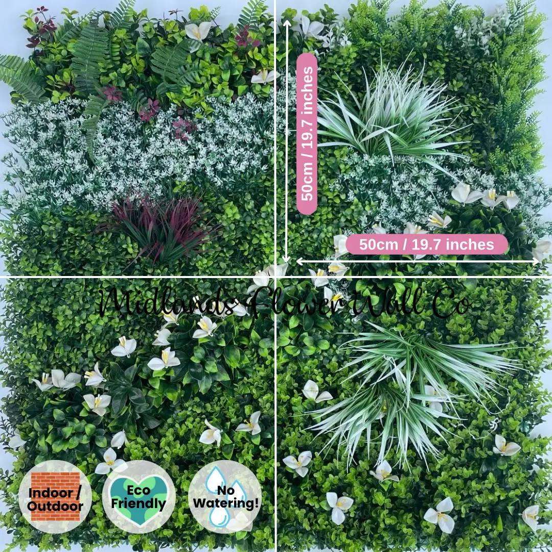 Artificial Flower Materials: All of our GreenGrid™ green wall outdoor / indoor tiles are produced using plastic foliage mounted onto a plastic mesh backing. Panels are not UV treated or flame retardant; however, topical sprays can be used to treat following purchase. For commercial property, we can recommend a certified service professional. Colours viewed on screen may appear slightly different in real life.